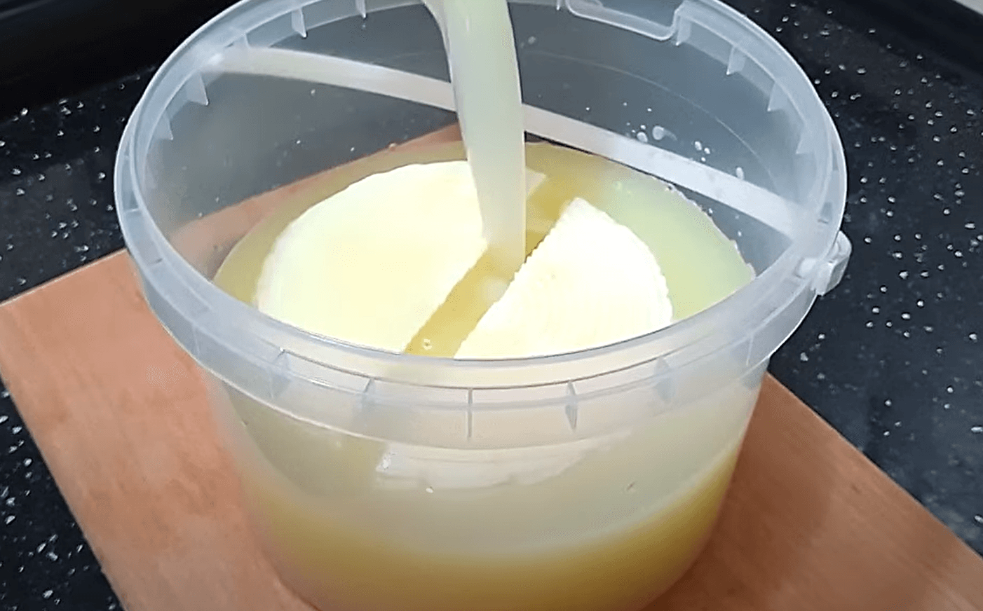 Коли сир трохи охолов, перевертаю його на інший бік. Я роблю це за допомогою двох пластикових кришок. Хоча сир ще гарячий, він вже добре тримає форму.