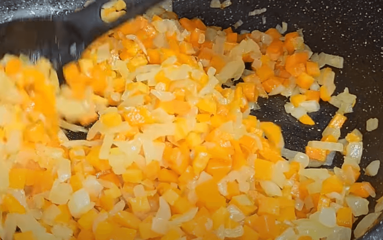 На розігріту сковороду наливаємо олію, кладемо нарізану на дрібний кубик цибулю, моркву також нарізану на дрібний кубик і смажимо, помішуючи, 5-7 хвилин.