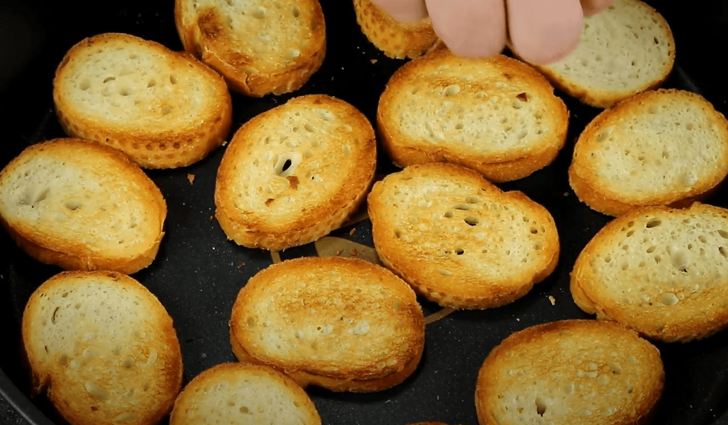 Батон нарізаємо на скибочки і смажимо на сухій сковороді до рум’яності.