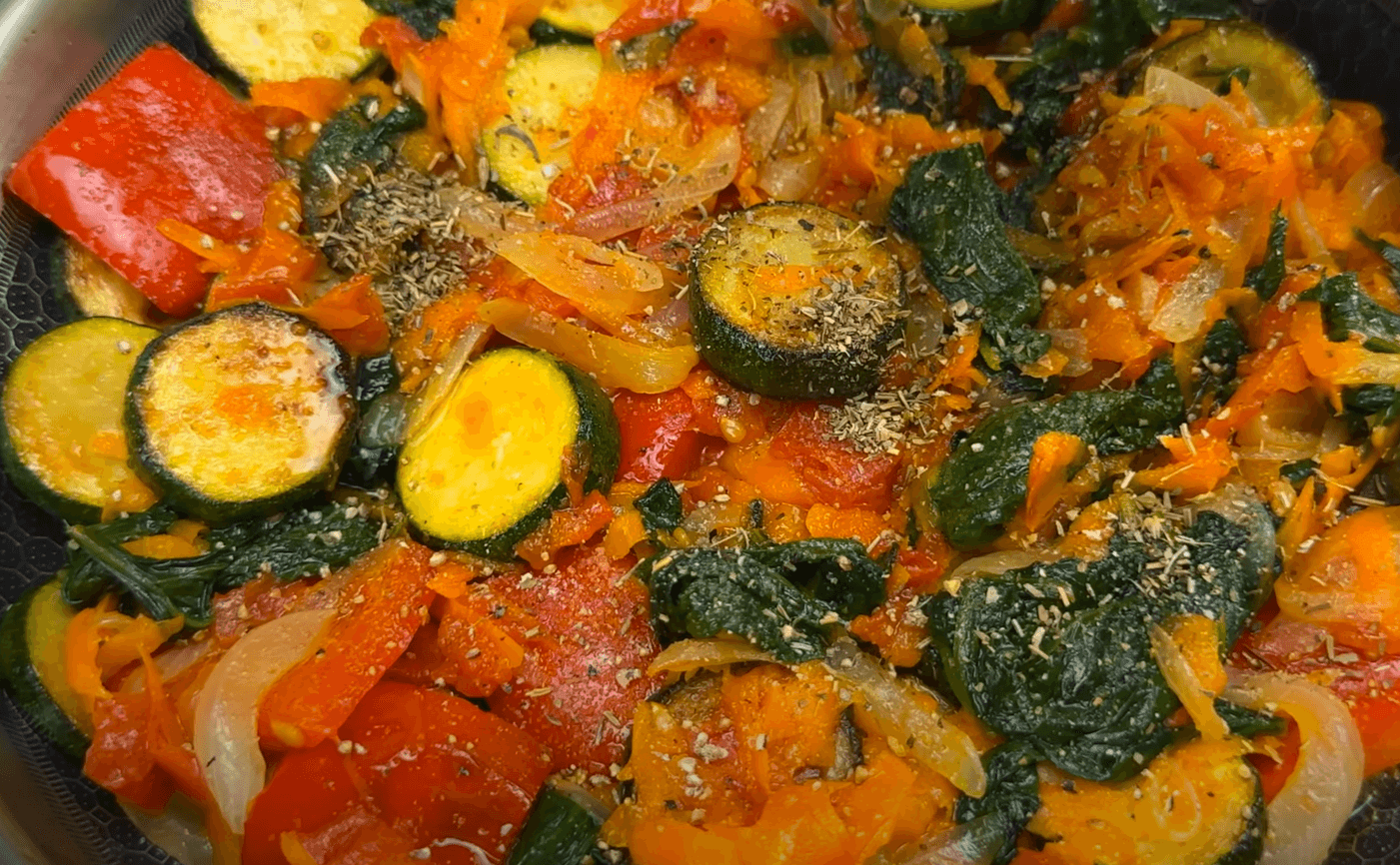 Далі додаю шпинат і перемішую. Тушкую 2-3 хвилини і перекладаю до кабачків з перцем.