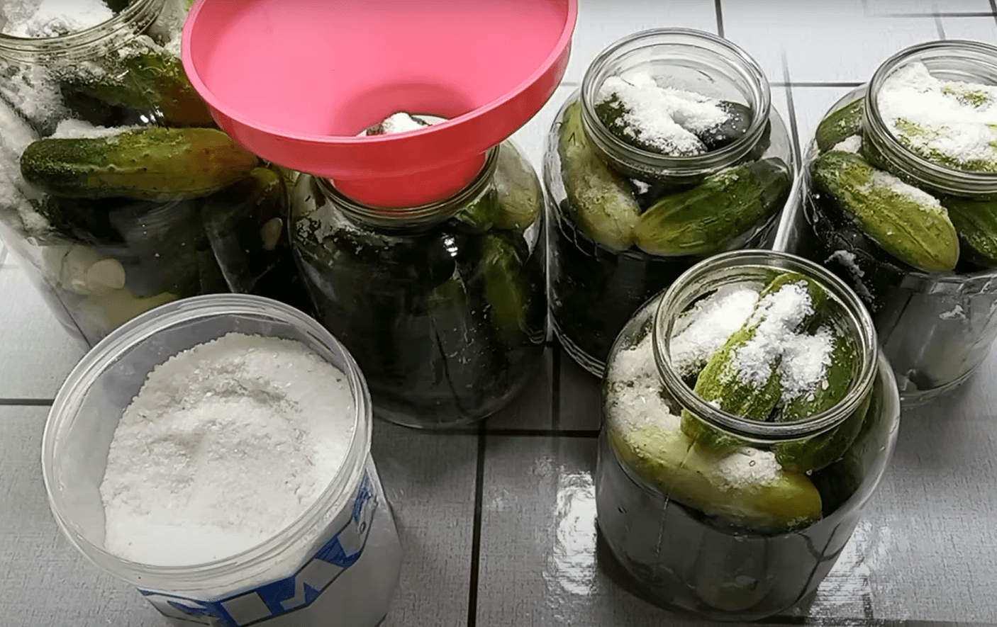 Додаю сіль прямо в банку, заливаю холодною водою і накриваю капроновими кришками.