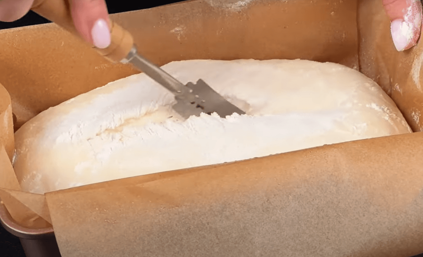 Залишаю ще на приблизно 30 хвилин, підійти. Потім трохи присипаю борошном і роблю надріз зверху.