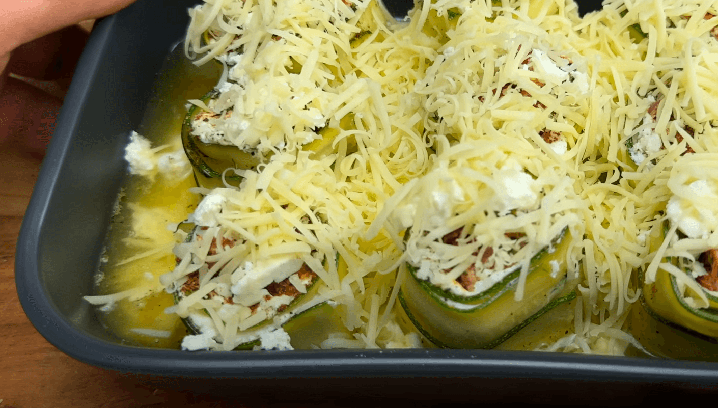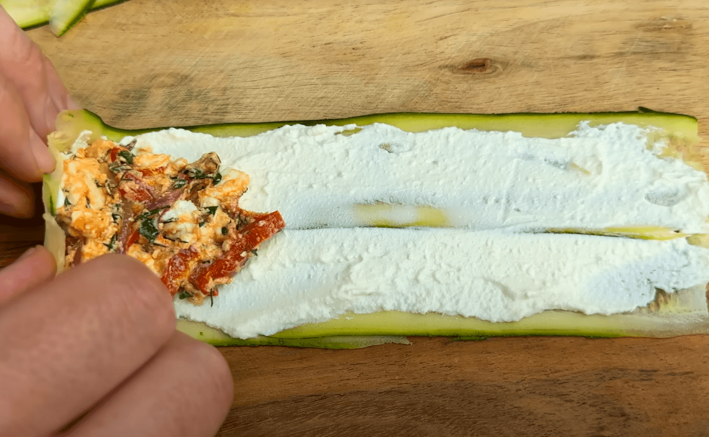 Викладаю начинку на смужки кабачка змащені рікотою і загортаю у рулетик.