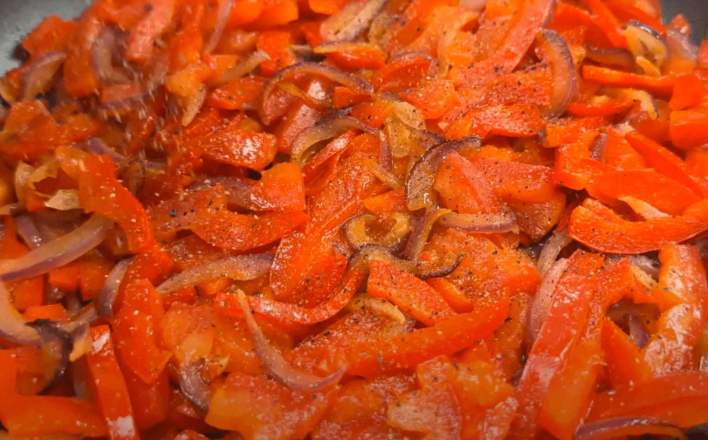 Додаю нарізаний соломкою перець і помідор, перемішую. солю, перчу до смаку і перемішую. Тушкую пару хвилин до готовності.