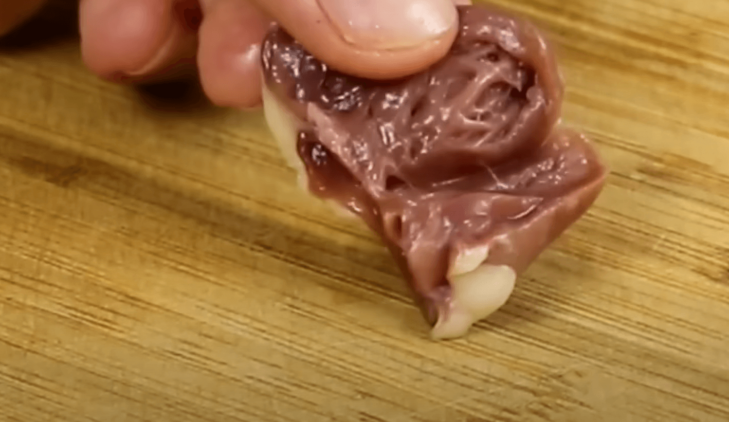 В курячих сердечках обрізаємо верх і розрізаємо навпіл, але не до кінця. Як на фото. Промиваємо водою.