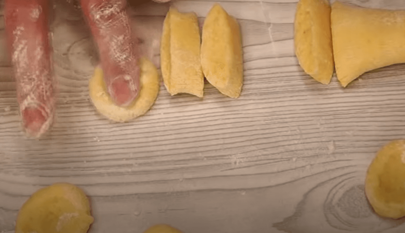 З кожної частини розгортаємо джгутик, діаметром 1,5 – 2 см. Розрізаємо на шматочки 1,5 – 2 см. Кожен шматочок обмокуємо липкою стороною в борошно, злегка притискаємо пальцем у серединці.