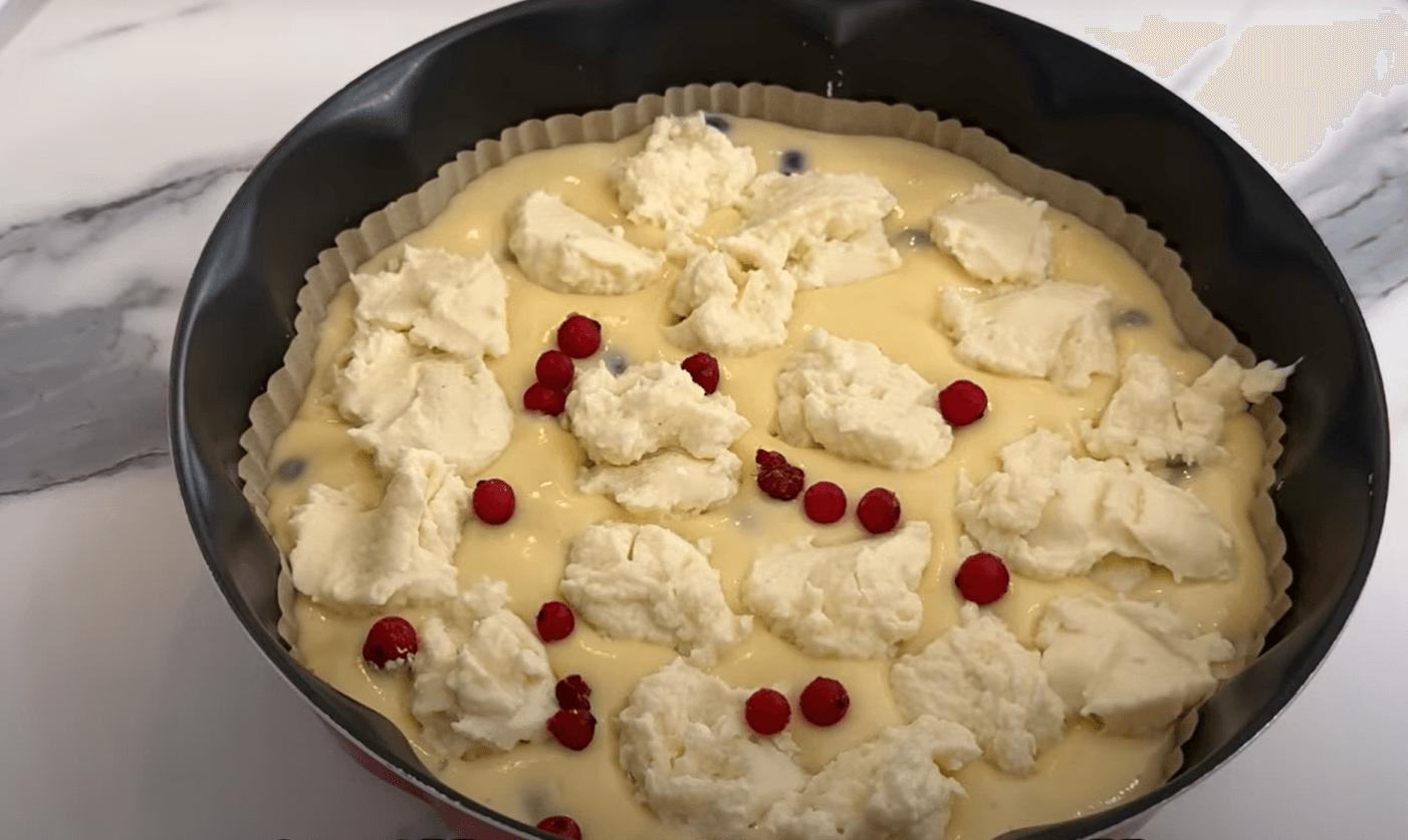 Всипаю до тіста ягоди і перемішую. Виливаю готову масу у форму застелену пергаментом і розрівнюю.