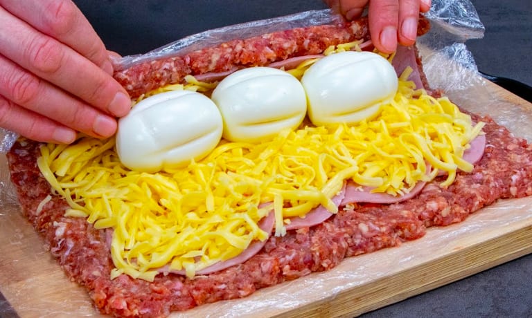 Додаємо майонез 3 ст. л., можна замінити сметану. Сир 100-150 г натріть на дрібній тертці, додаємо до помідорів і перемішуємо. Розподіляємо по м’ясу.