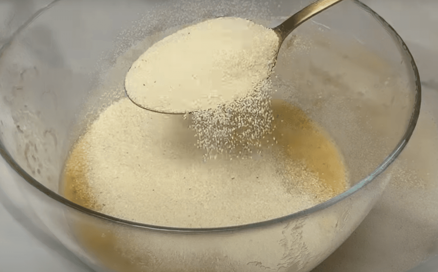 Далі додала п’ять повних столових ложок манної крупи. Окремо змішала пів чайної ложки розпушувача з ложкою пшеничного борошна, так він рівномірніше розподілиться і також висипала в тісто.