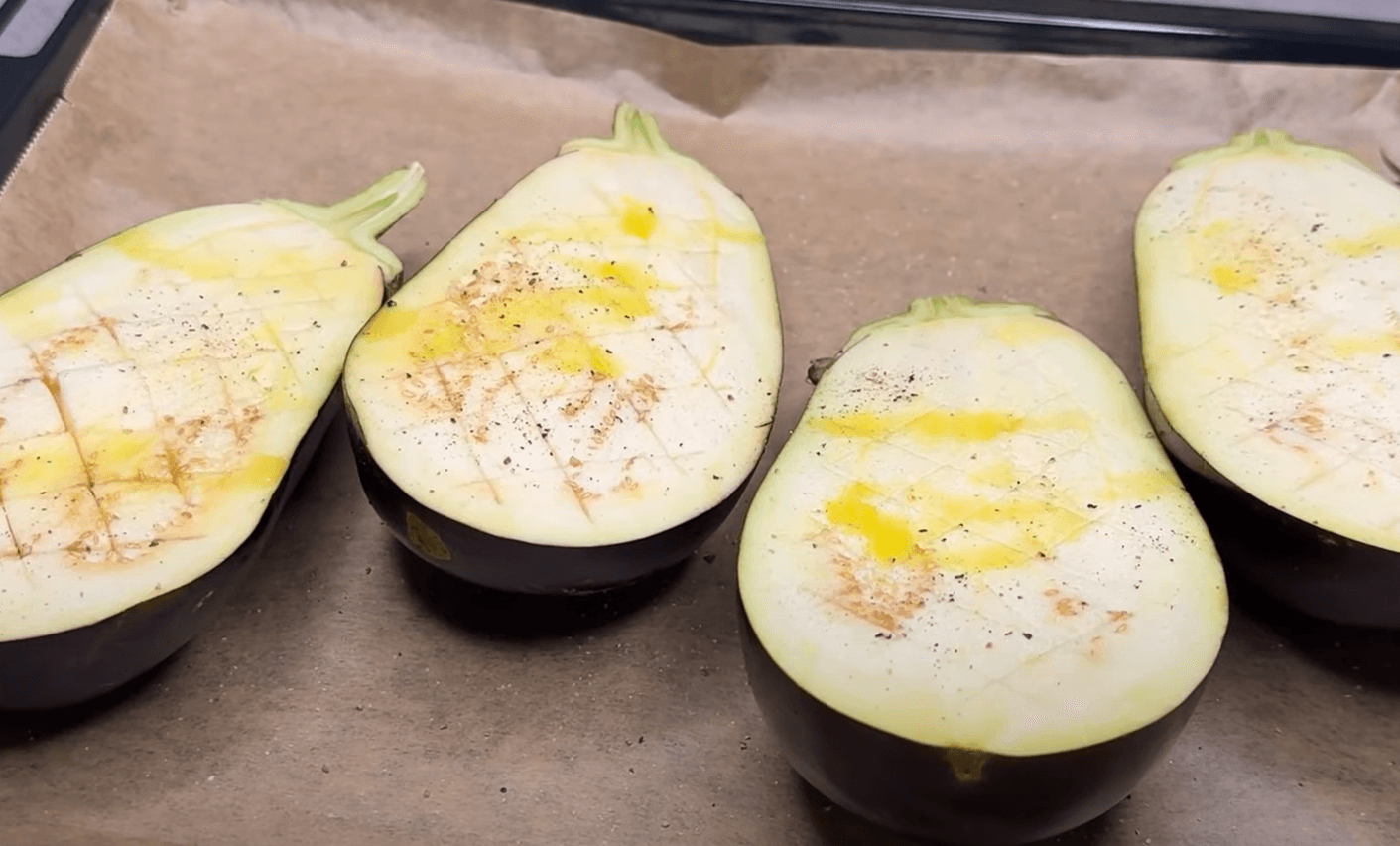 Беру 2 баклажани, розрізаю навпіл, роблю сітку по середині, злегка солю, перчу і змащую оливковою олією.