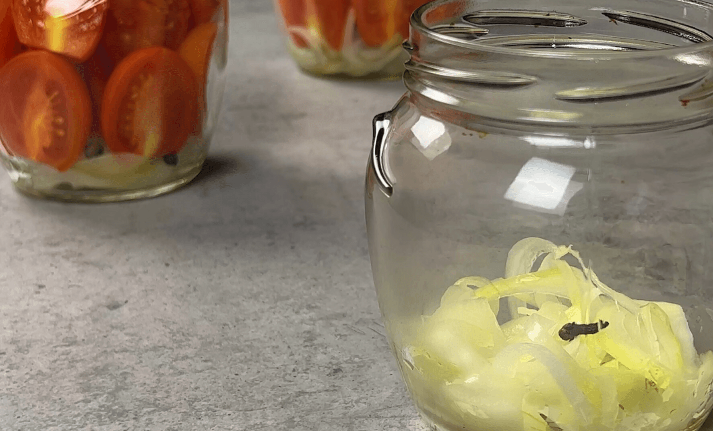 На дно банки кладу 2-3 столові ложки цибулі. Додаю 1 бутон гвоздики, 2 горошини запашного перцю та 5 горошин чорного перцю.