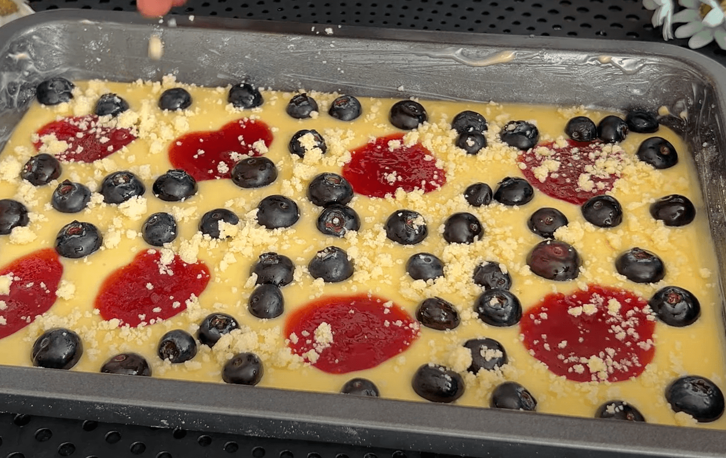 На тісто викладаємо по 1 ч. л. варення, ягоди чорниці (можна замінити за бажання на інші) і посипаємо зверху крихтою.