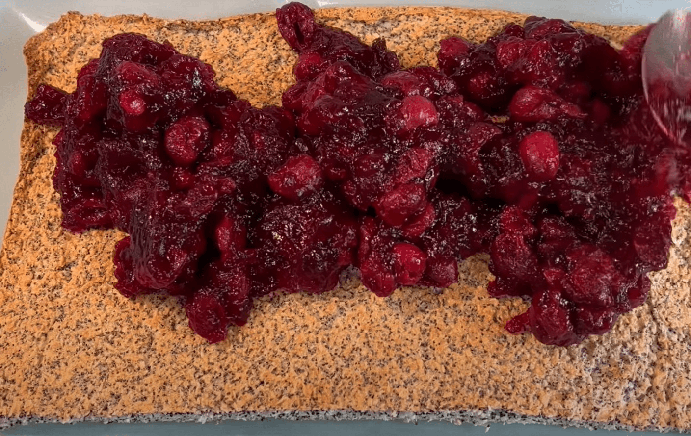 Збираємо торт. На перший корж викладаємо вишневу прошарку, вона вже тримає форму.