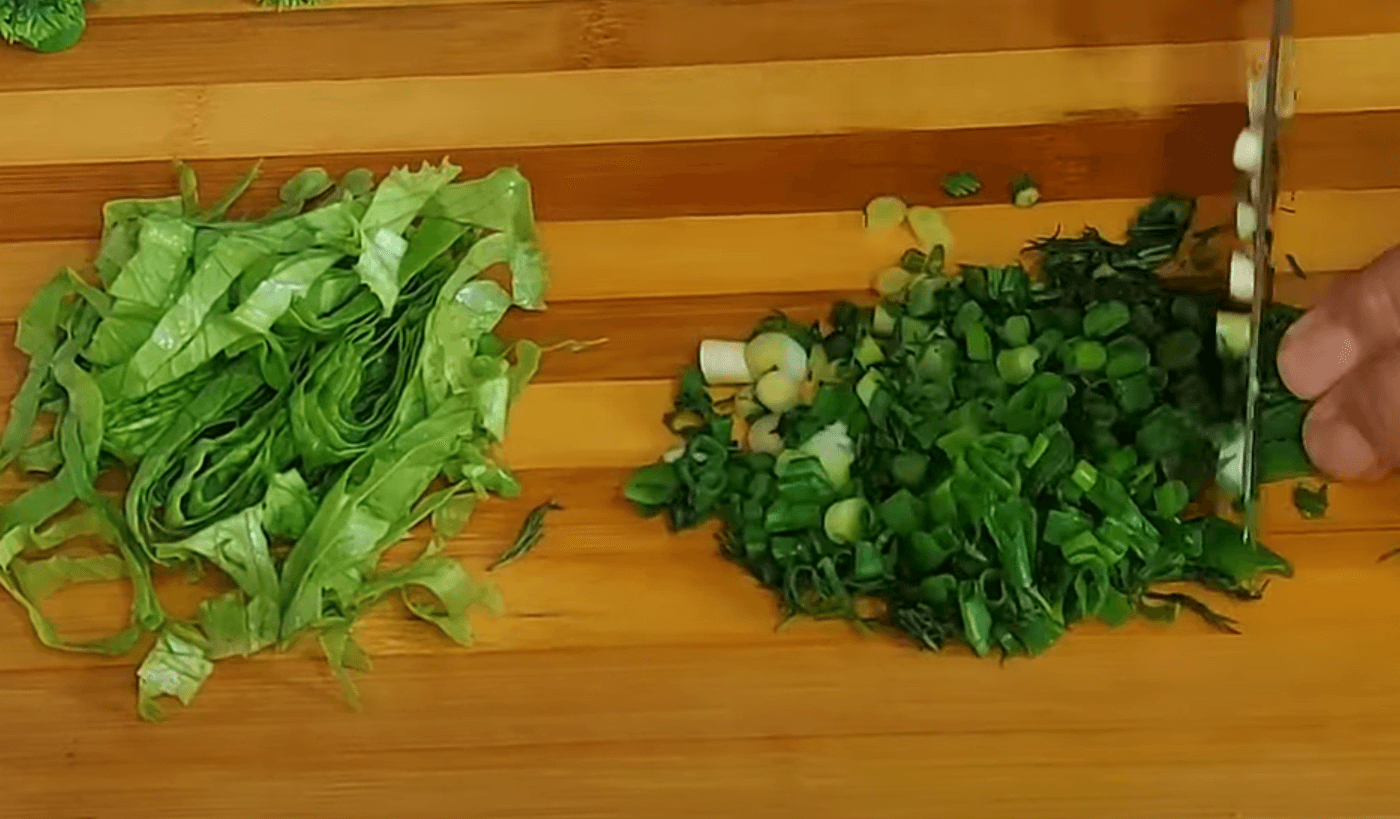 Дрібно нарізаємо листя салату, зелень цибулі та кропу та зубець часнику. Кладемо в миску до решти інгредієнтів.