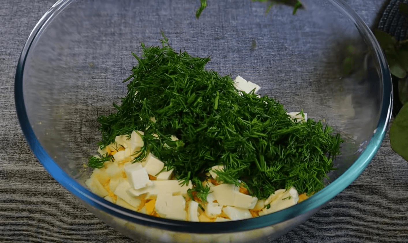 Тим часом нарізаю на кубики чотири варені яйця і кладу в миску. Додаю два плавлені сирки нарізані дрібну соломку або натерті на тертці.