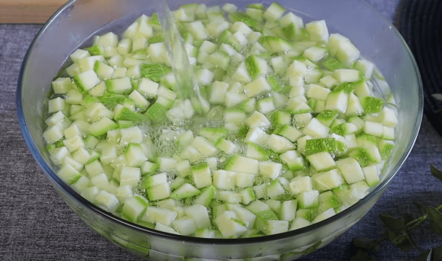 Молоденькі кабачки нарізаю невеликими кубиками. Шкірку не очищаю, вона ще тоненька й ніжна. Кладу в миску, заливаю окропом і залишаю на кілька хвилин.