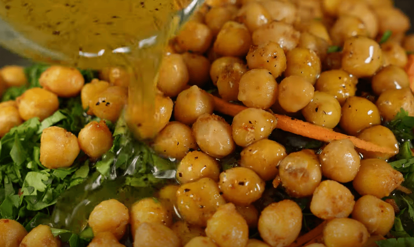 Додаємо зелень петрушки або кінзи, смажений нут. Заправляємо все підготовленим соусом.