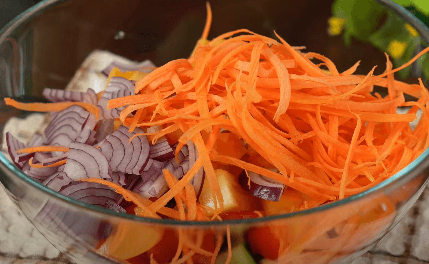 Додаємо нарізану чверть кільцями червону цибулю, та натерту на тертці для корейської моркви або на грубій тертці моркву.