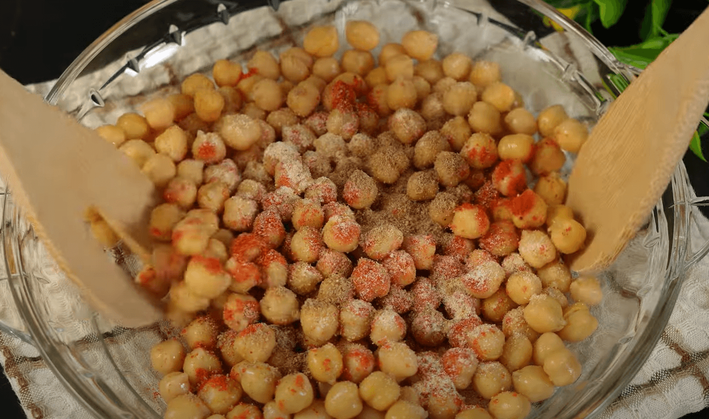 Висипаємо нут у миску, додаємо паприку, сухий часник, мелений кмин і все перемішаємо та залишимо маринуватись на 5 хвилин.
