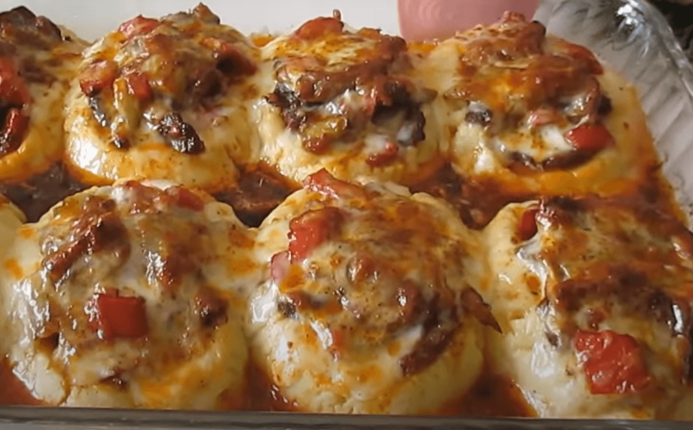 У форму для запікання виклала картопляні гнізда, наповнила їх м’ясною сумішшю. На дно форми вилила соус.