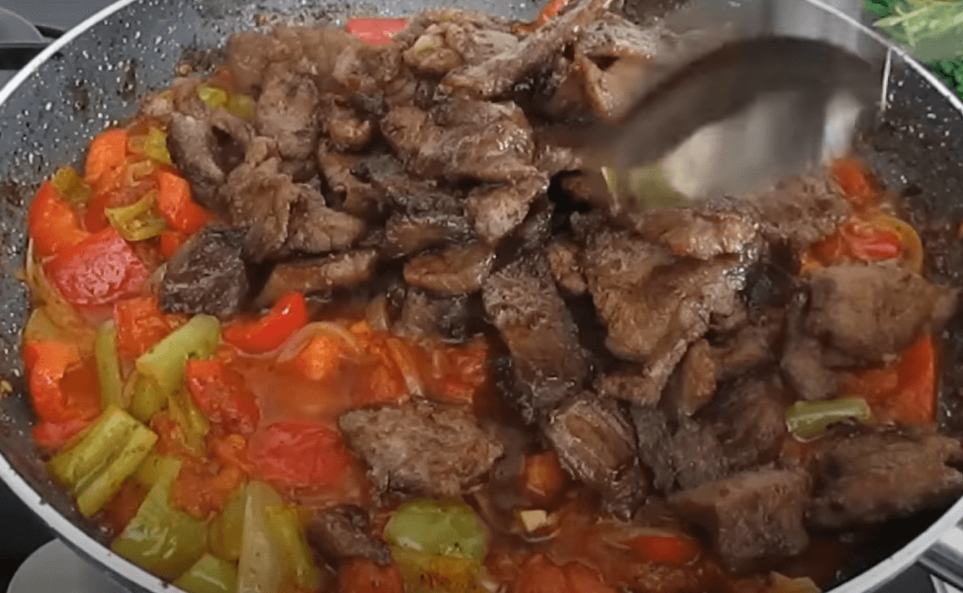 Посолила, додала чорний перець, сушену м’яту і трохи червоних пластівців. Потушкувала кілька хвилин і додала до овочів раніше обсмажене м’ясо.
