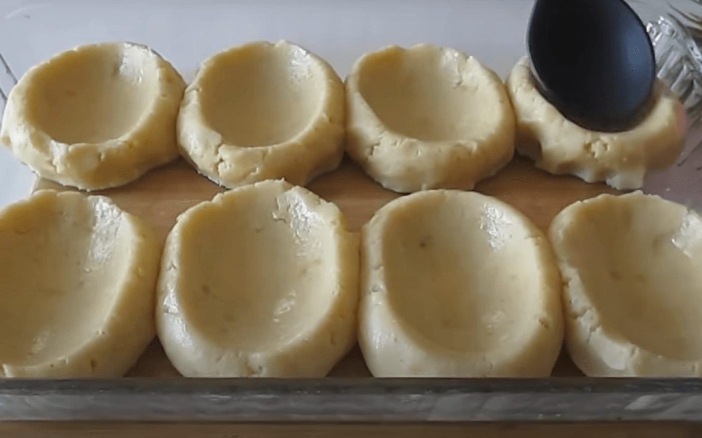 Щоб не липло до рук, змастила їх олією, сформувала з пюре вісім однакових кульок, зробила в кожній заглиблення ложкою.