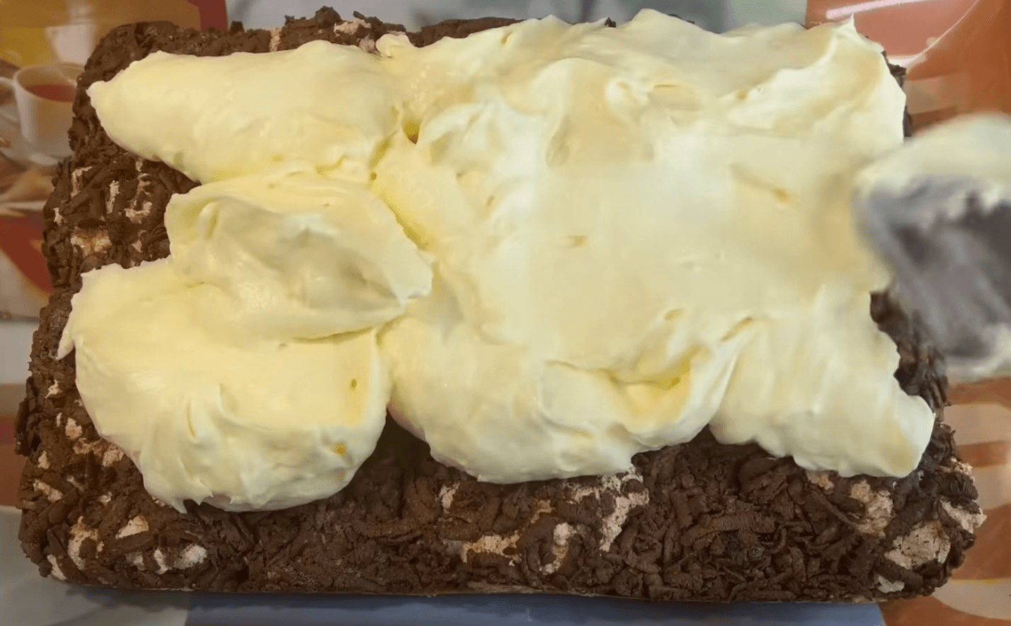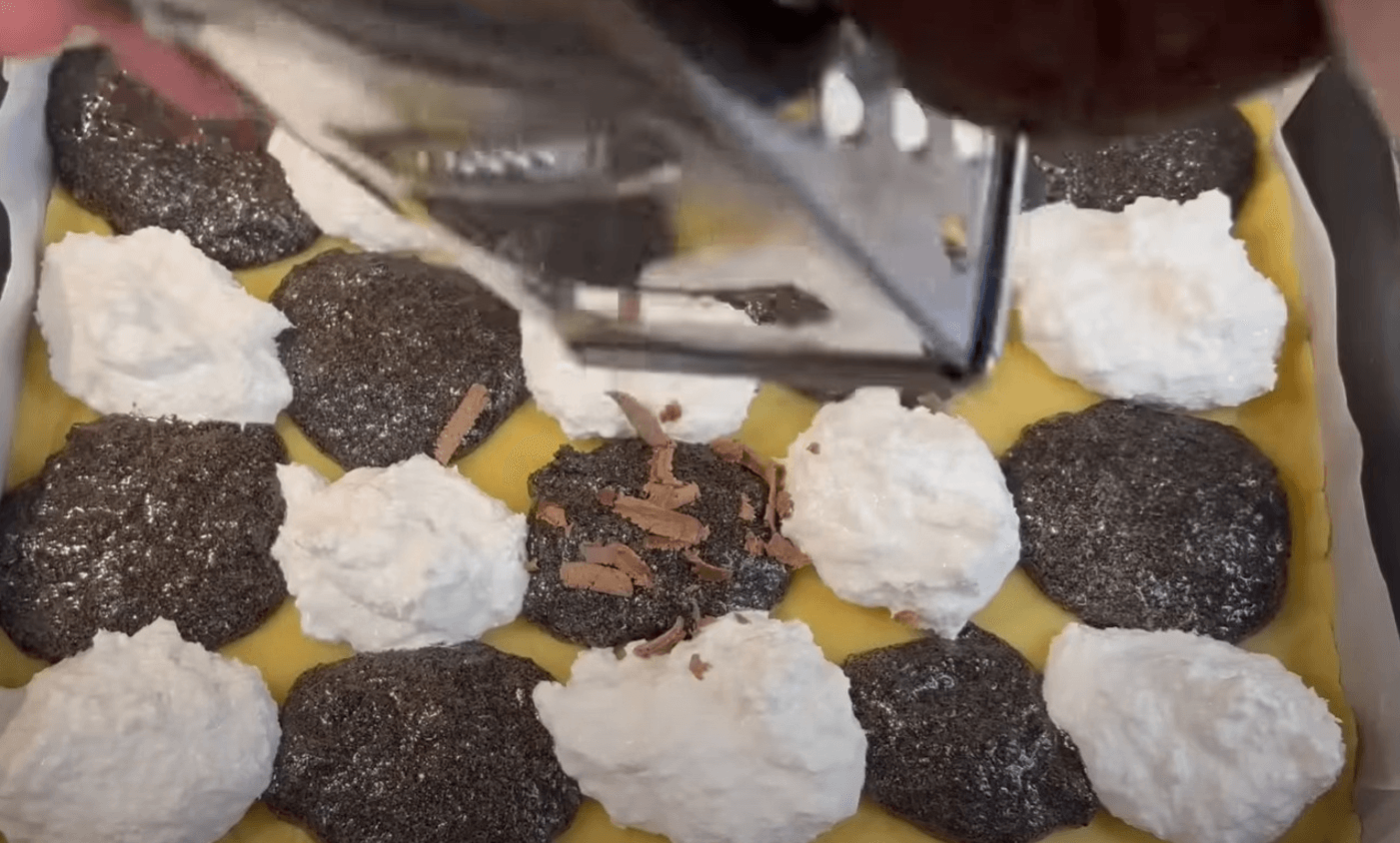 У мене форма 20*30. Кокосову і макову начинку потрібно розділити візуально на 2 частини. Викладаємо кокосову і макову начинку в шахматному порядку на корж.