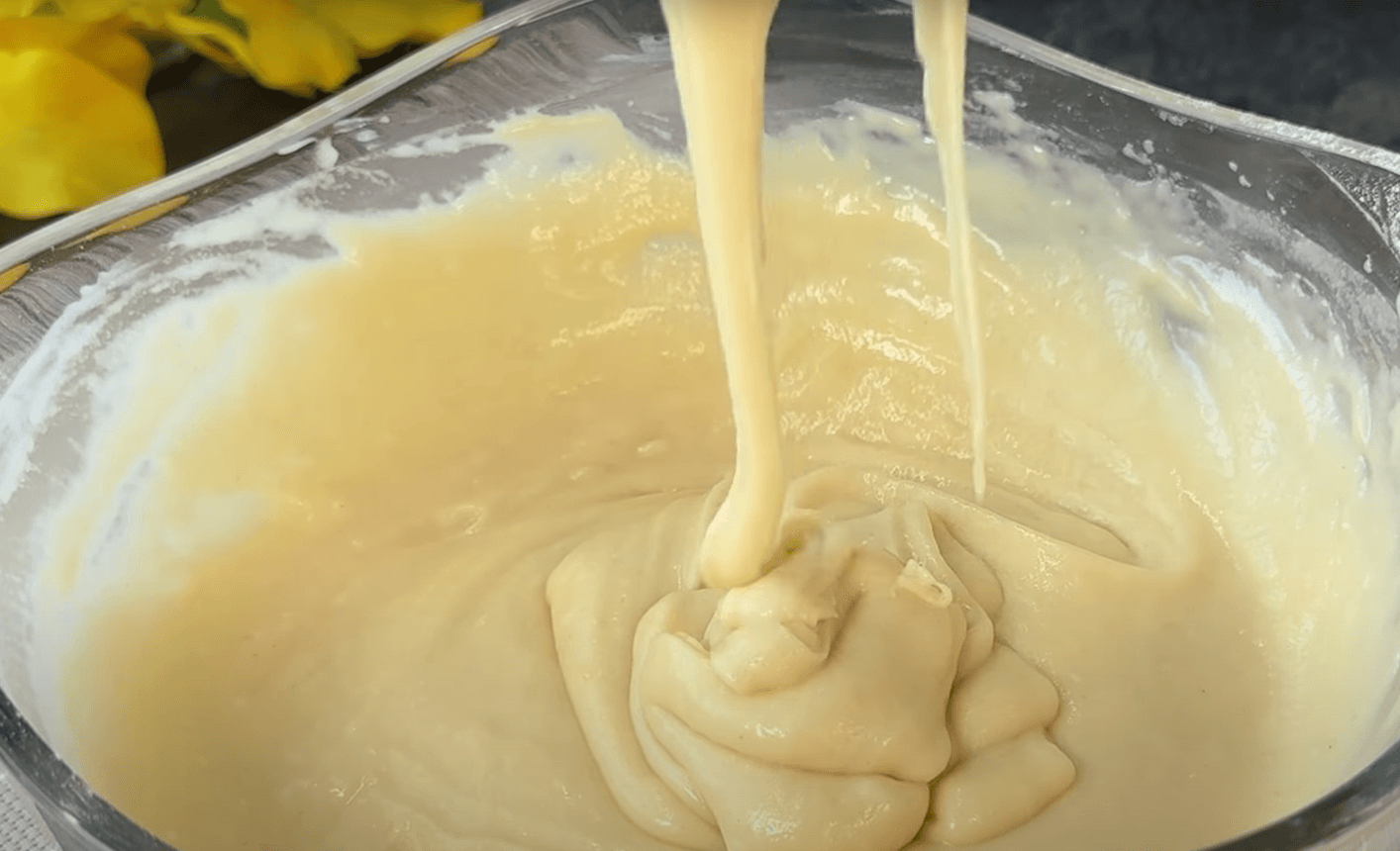 Просіваю 210 г борошна разом із 7 г розпушувача. Додаю суху суміш у рідке тісто і замішую однорідну масу без грудочок. Якщо є бажання, можна додати трохи розведеного крохмалю, тоді випічка залишиться м’якою навіть наступного дня.