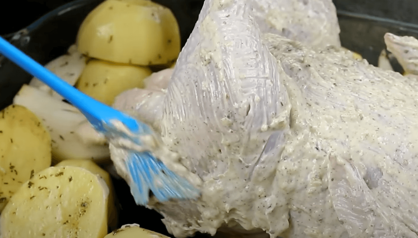 В окремій мисці змішую майонез, пропущений через прес часник, сіль, чорний перець і прованські трави.
