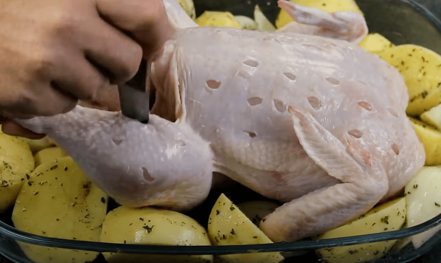 Курку просушую паперовими серветками, обрізаю все зайве і кладу в форму до картоплі і роблю ножем проколи.