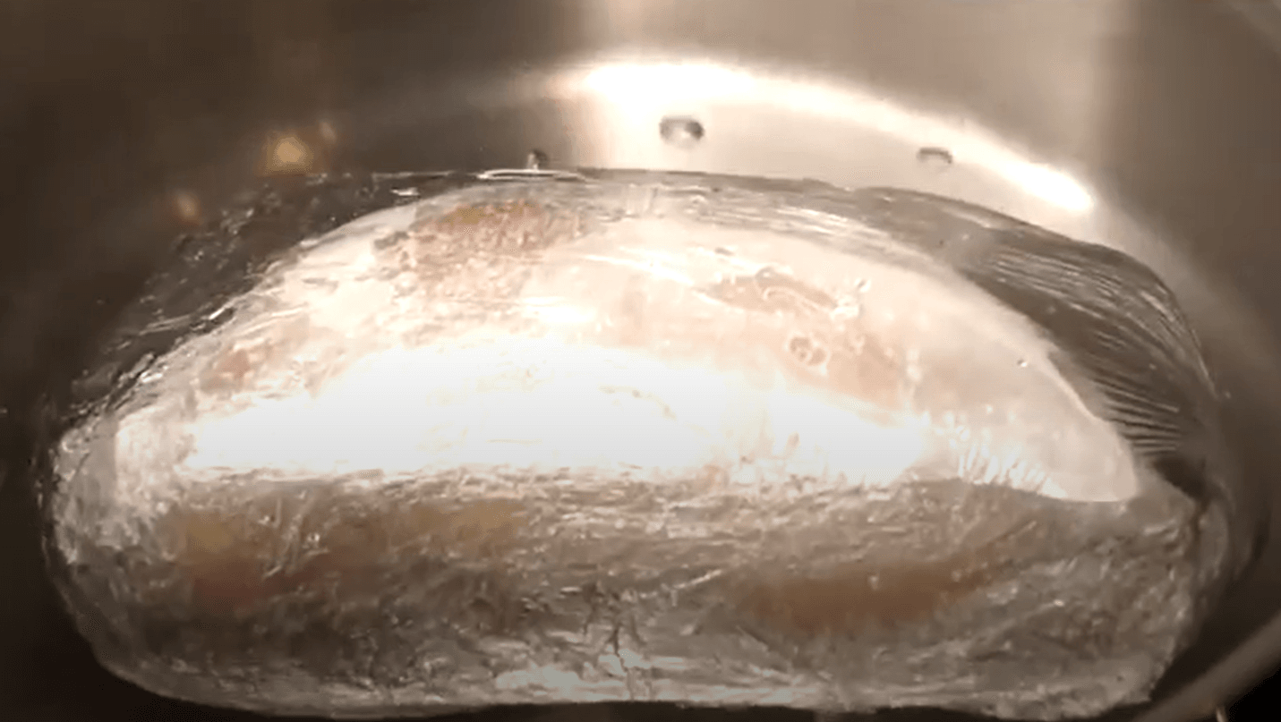 Після закінчення часу, кладемо рульку в каструлю не знімаючи плівку, так шинка буде готуватися у власному соці.