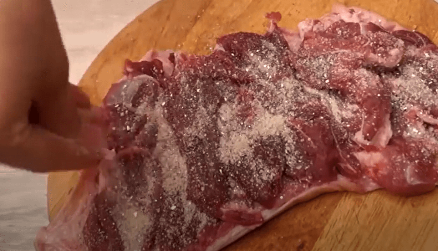 Злегка відбиваємо молоточком із двох сторін. Шкірку від рульки теж злегка відбиваємо з внутрішнього боку, укладаємо м’ясо на рульку.