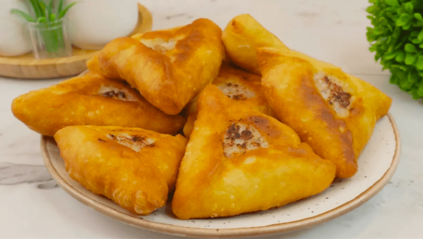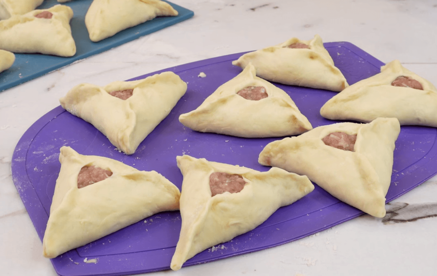 Робимо колобки, потім беремо один колобок формуємо паляничку, на середину кладемо начинку і формуємо трикутник. Але до кінця не защипуємо, має залишитися отвір.