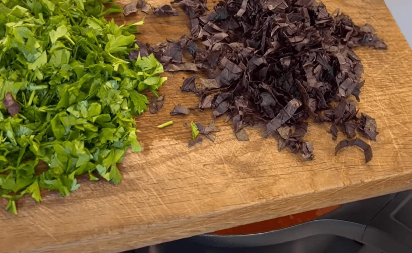 Далі додала подрібнену зелень базиліку і петрушки, можна лише щось одне або замінити кінзою.