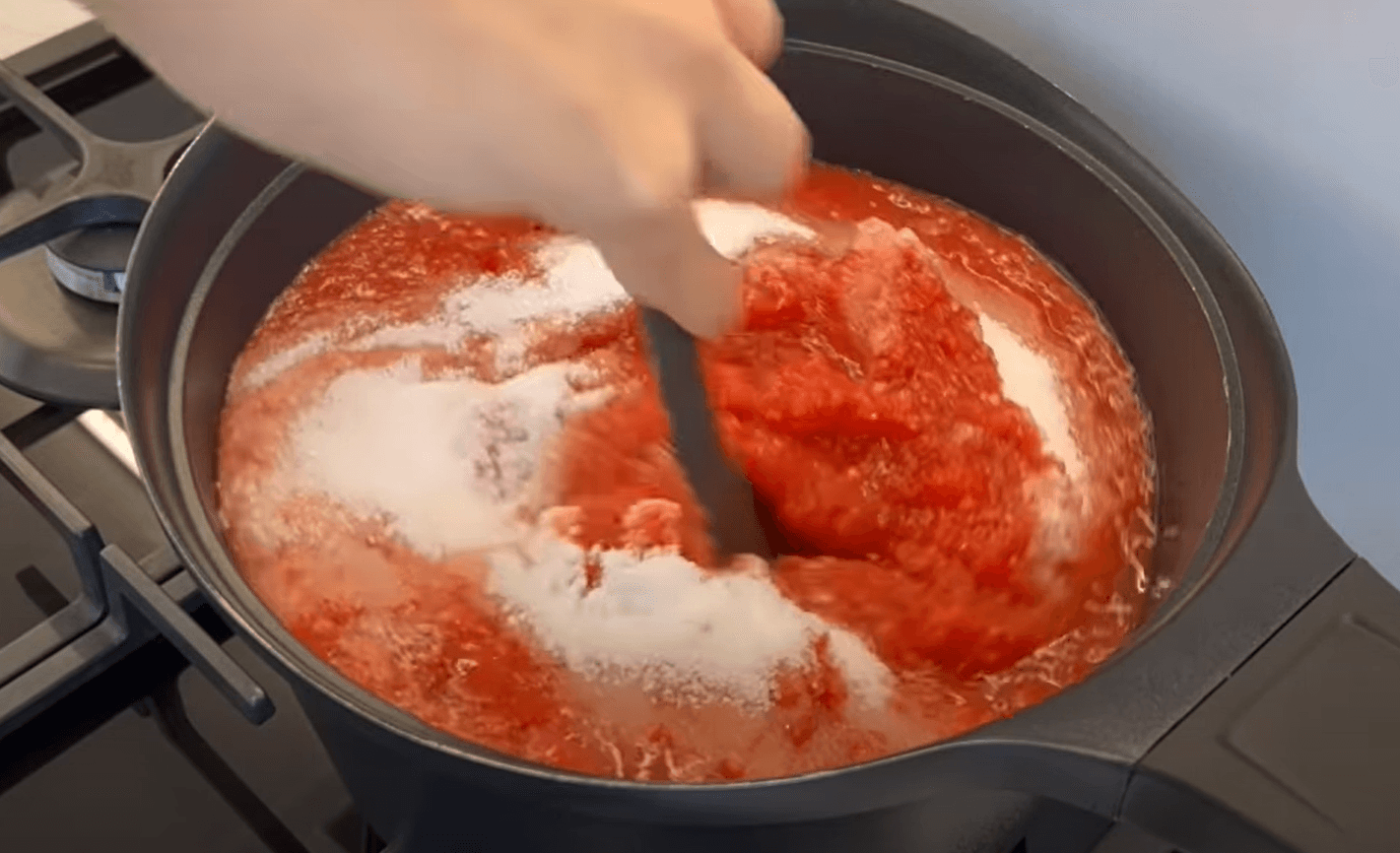 Перекручену масу переклала в каструлю з товстим дном, додала сіль і цукор, довела до кипіння і проварила 15 хвилин на невеликому вогні, періодично помішуючи.
