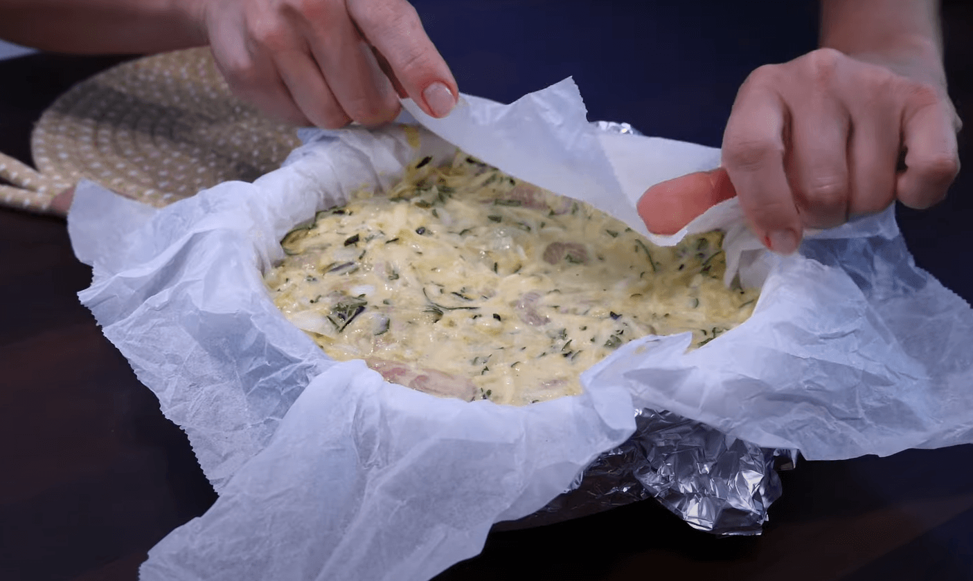 Виклала всю масу у форму, злегка утрамбувала ложкою, щоб не було пустот. Верх прикрила пергаментом, щоб запіканка не надто підгоріла на початку.