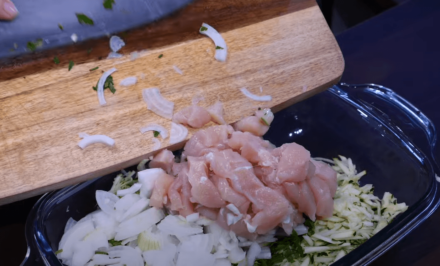 У велику миску виклала натерті кабачки, зелень, порізану цибулю та курятину. Кабачки треба трохи відтиснути.