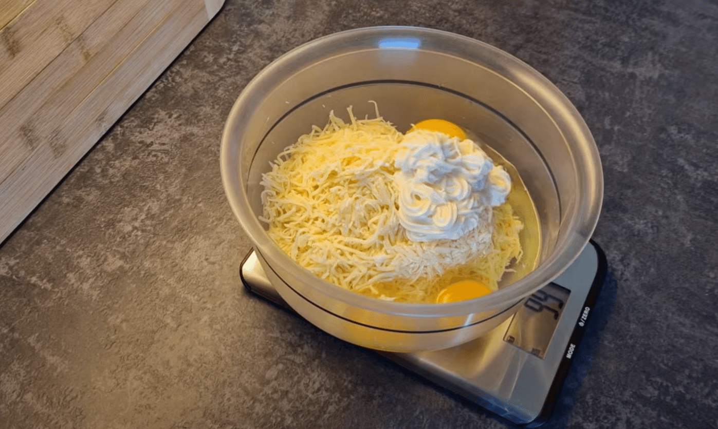 В миску на середній тертці натираємо сир. Вибиваємо до сиру яйця. Додаємо майонез.