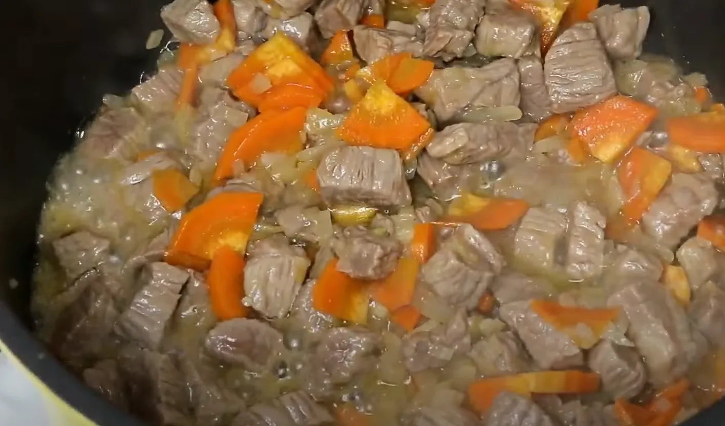 Смажимо 3-4 хвилини. Нарізаємо на невеликі кубики яловиче м’ясо і відправляємо в каструлю. Перемішуємо і смажимо 4 хвилини.