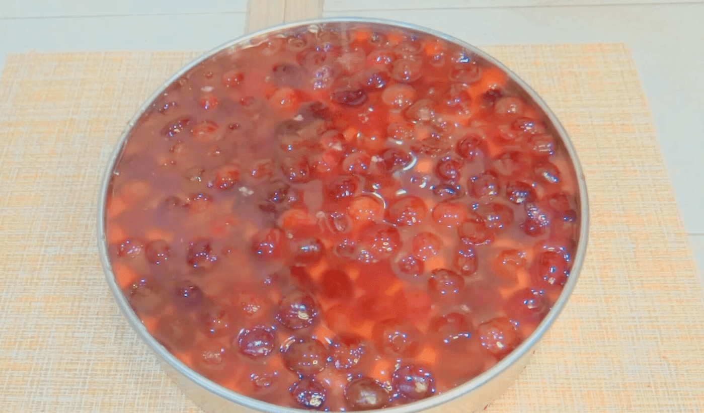 Якщо ви використовуєте звичайне желе, розводьте просто водою – там і так багато цукру. Вишню рівними колами викладаємо поверх застиглої сирної маси.
