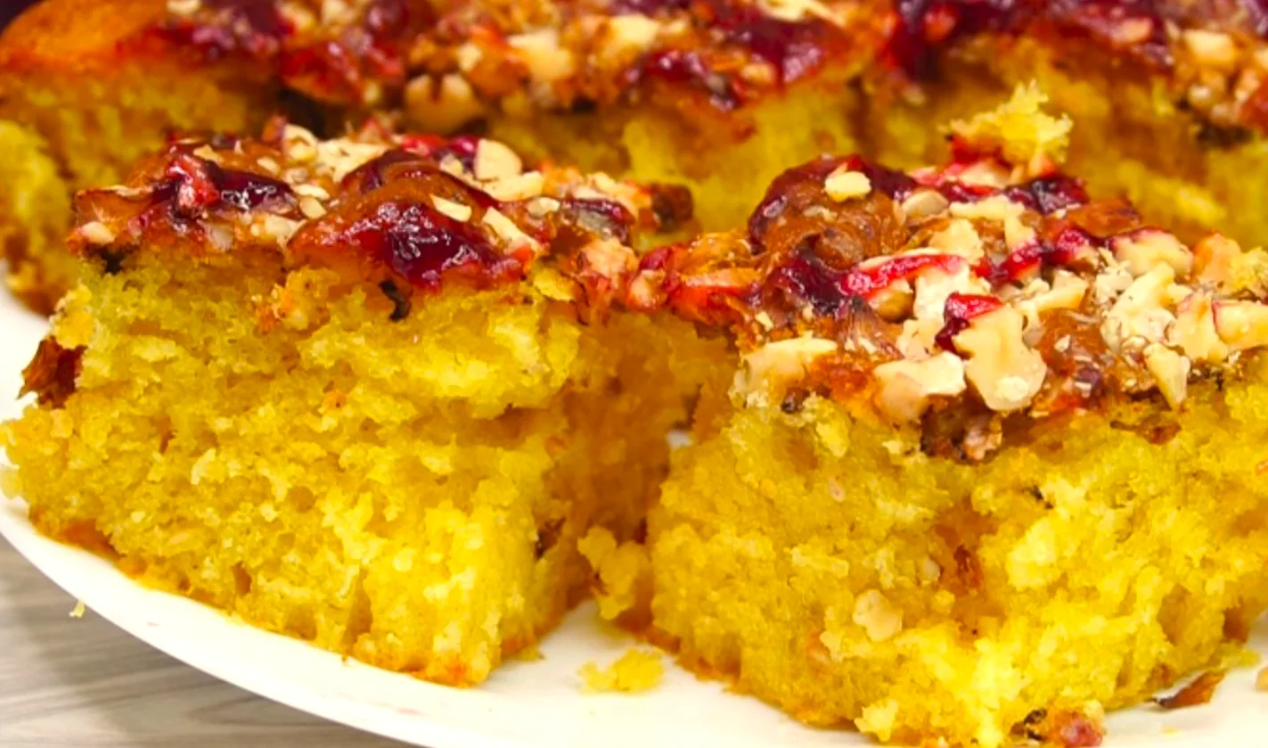 Витягаємо з форми. Поки гарячий пиріг можна його просочити за бажанням джемом. Розрізаємо та подаємо до чаю.