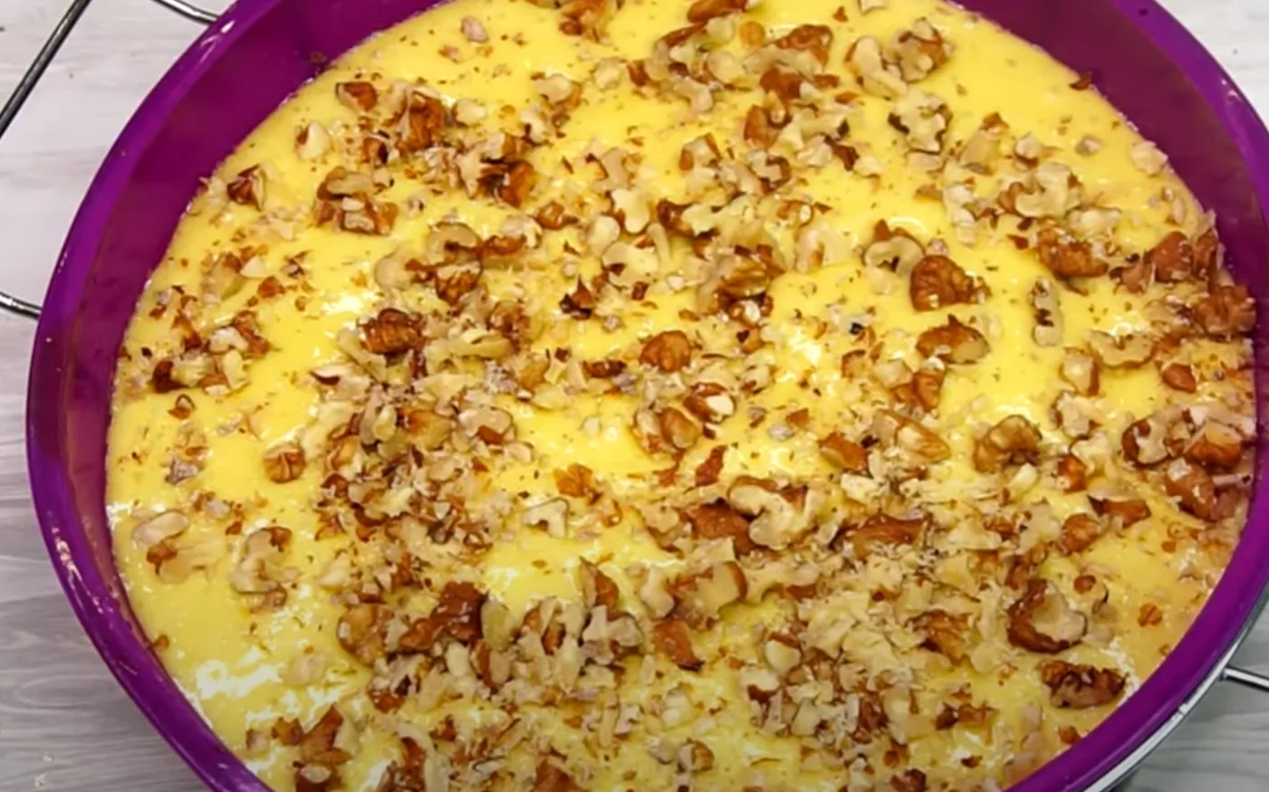 Щедро посипаємо на тісто горішками. Ставимо в духовку і випікаємо при температурі 180 градусів 25-30 хвилин. Готовність можна перевірити дерев’яною шпажкою.