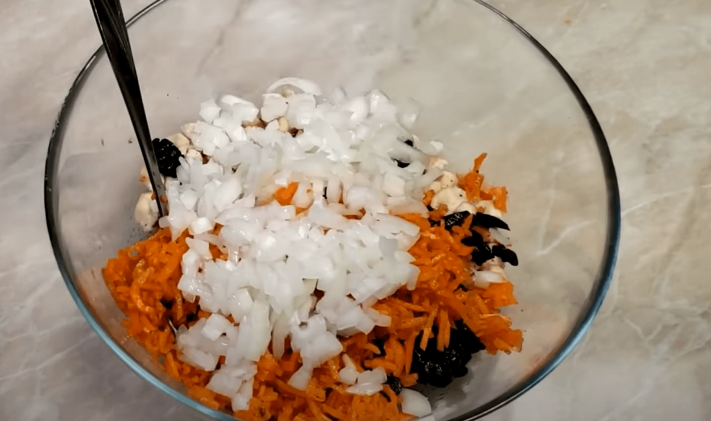 Тепер беремо корейську моркву і нарізаємо її на менші соломинки. Кладемо в миску до м’яса і чорносливу. Також додаємо цибулю.