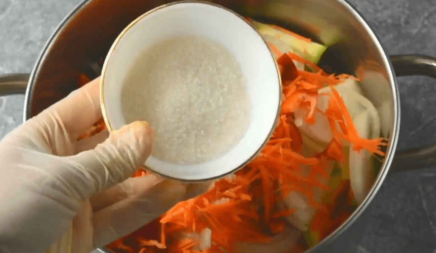 Солодкий перець нарізаємо на дрібні шматочки. Всі овочі відправляємо каструлю. Солимо, додаємо цукор та спеції, олію та оцет.
