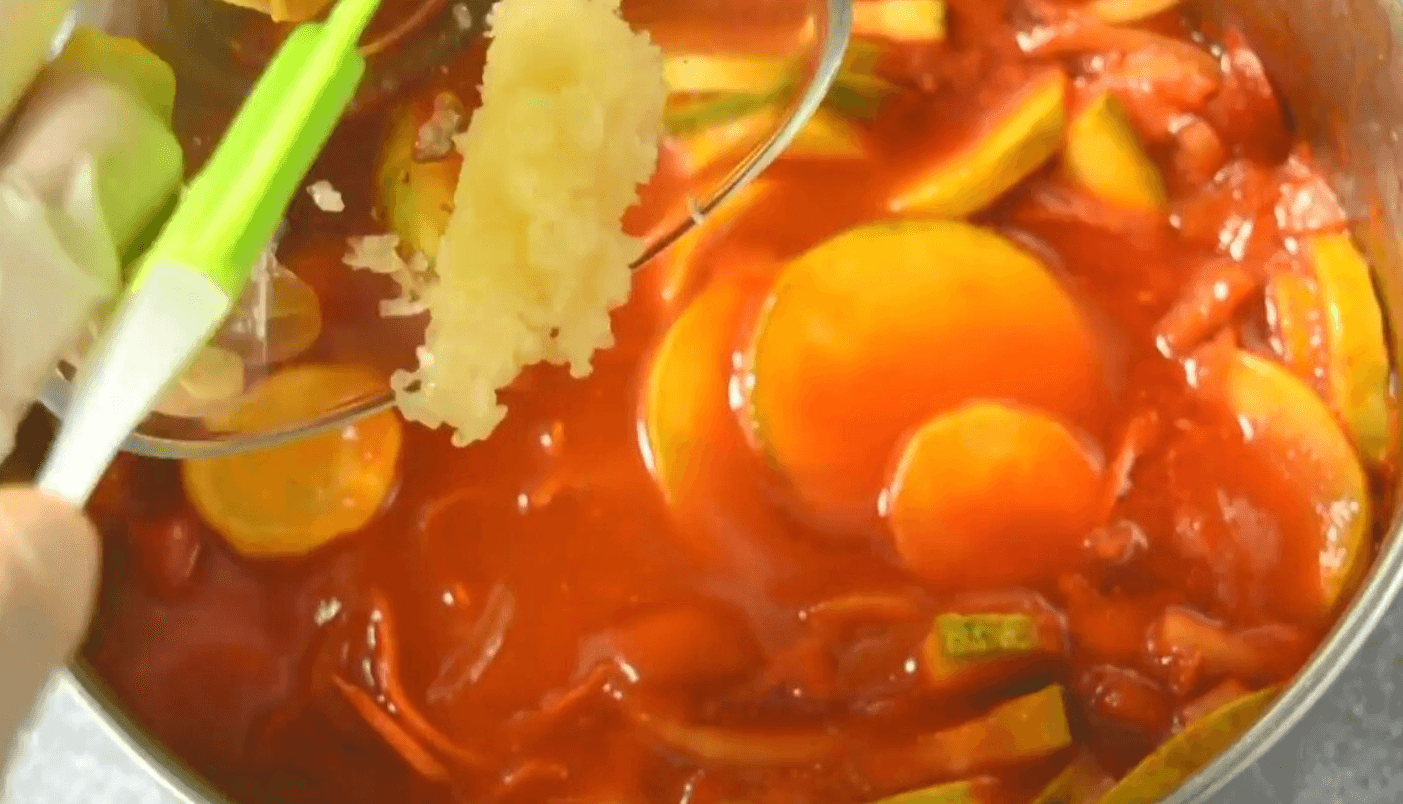 Додаємо подрібнений часник до продуктів та перемішуємо. Продовжуємо готувати до 30 хвилин після закипання.