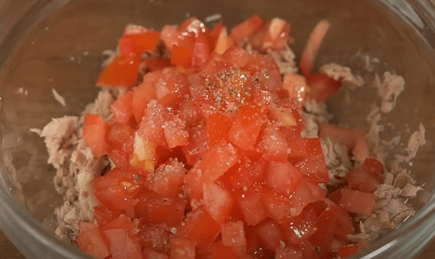 Нарізаний помідор додаємо до тунця. Все трохи посолимо, поперчимо чорним меленим перцем.