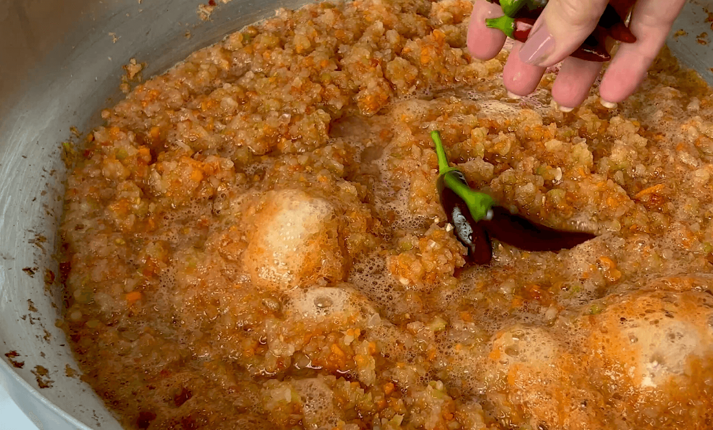 Як тільки кабачки закиплять додаю 5 штучок гострого перцю цілком, якщо любите гостріше, додайте нарізаний перець.