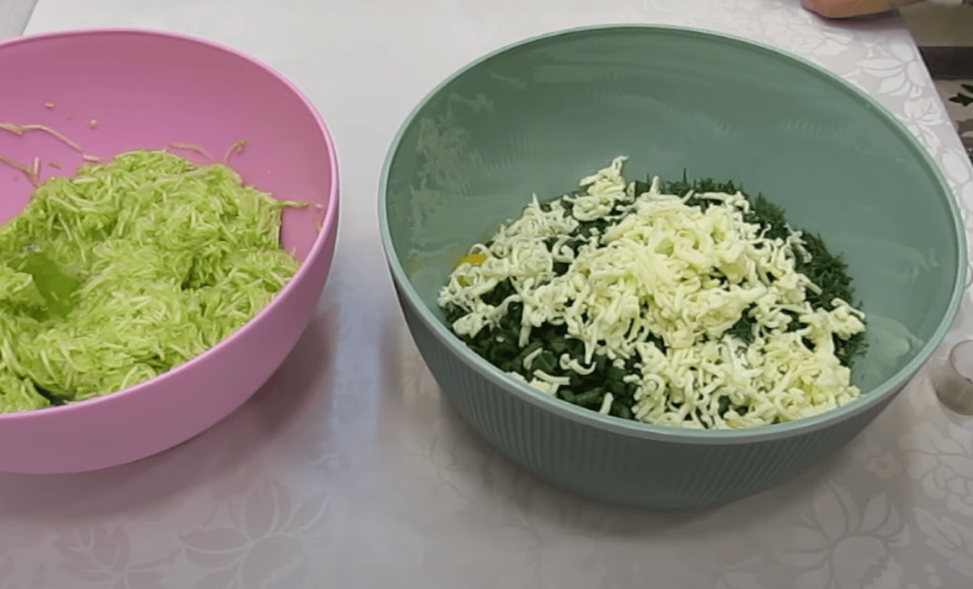 Кабачки за цей час пустили багато соку, я обережно їх віджимаю. Рідину не використовую. Відтиснуту масу додаю до сирної, ще раз все ретельно перемішую.